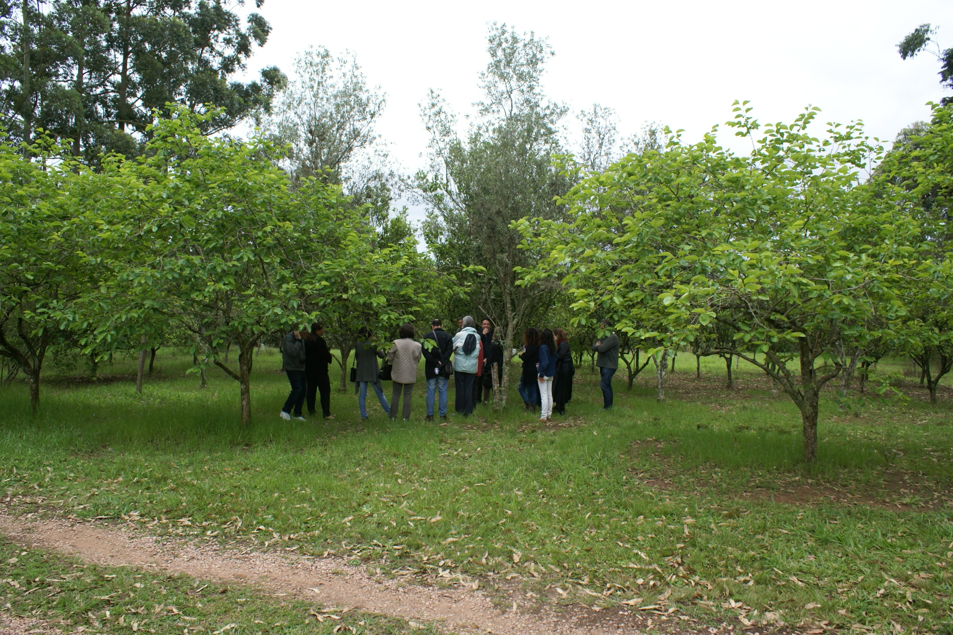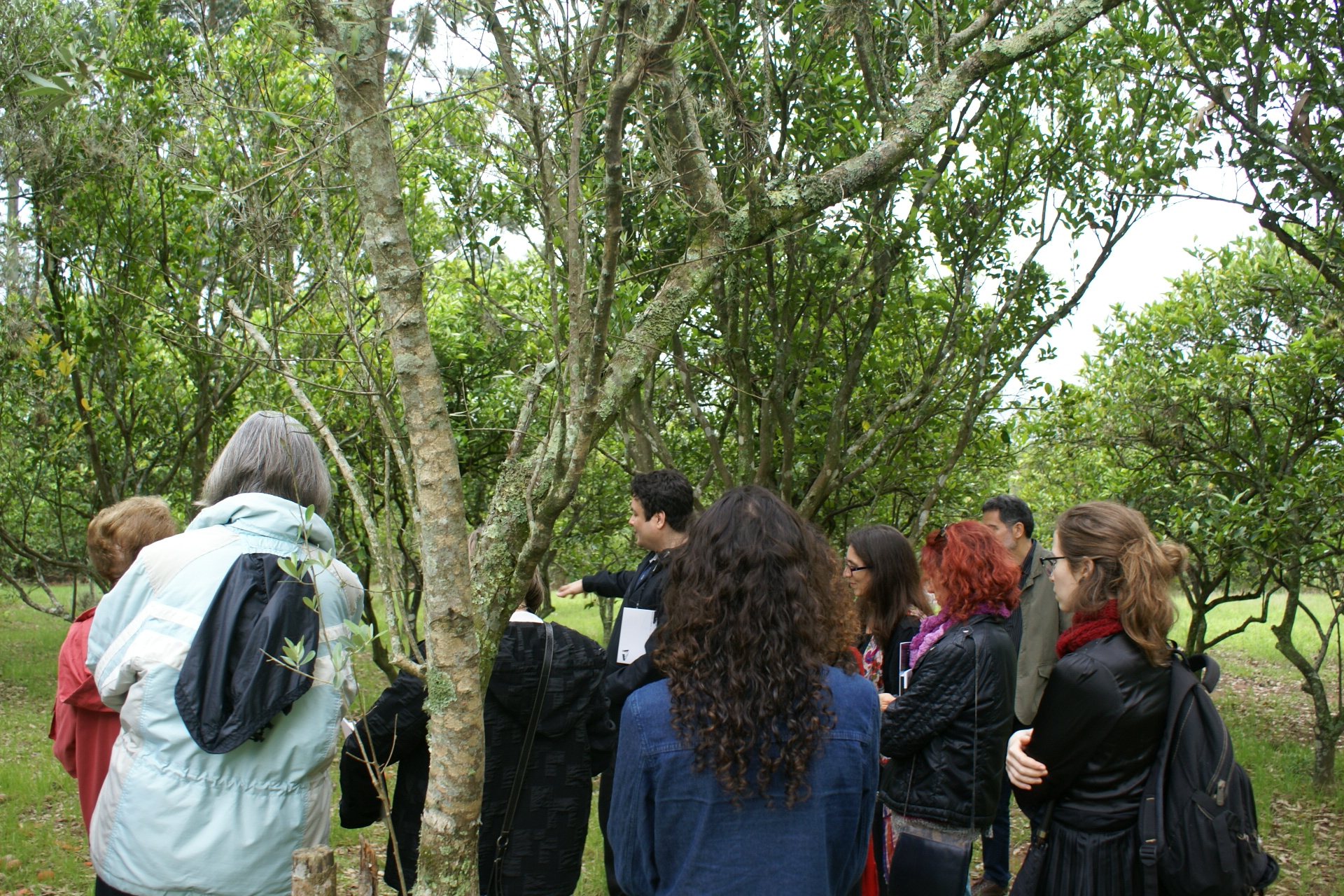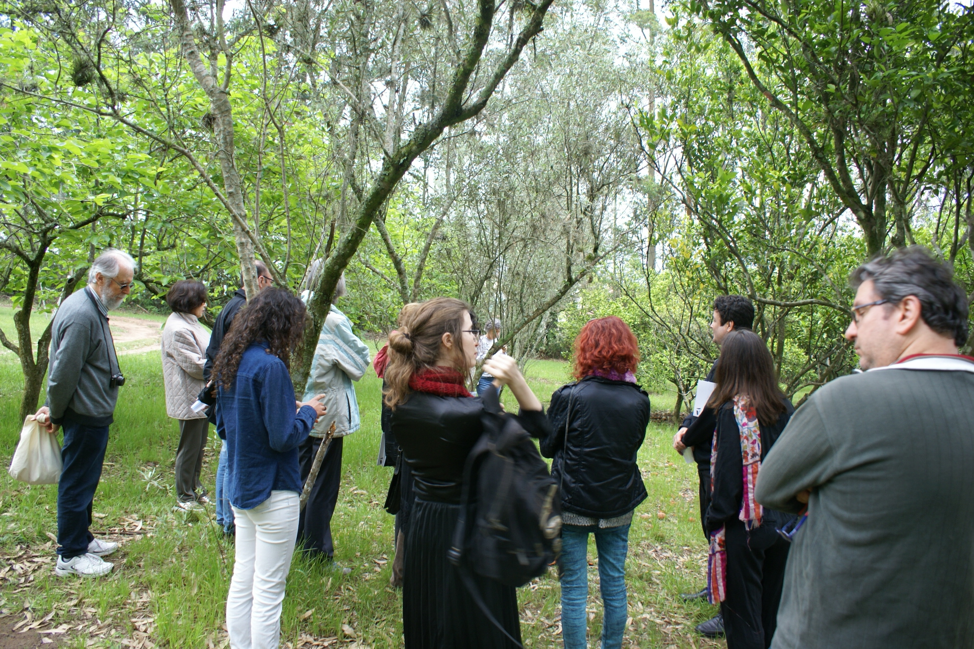 O artista Antônio Augusto Bueno conversa com o público sobre sua obra no pomar da Fundação.