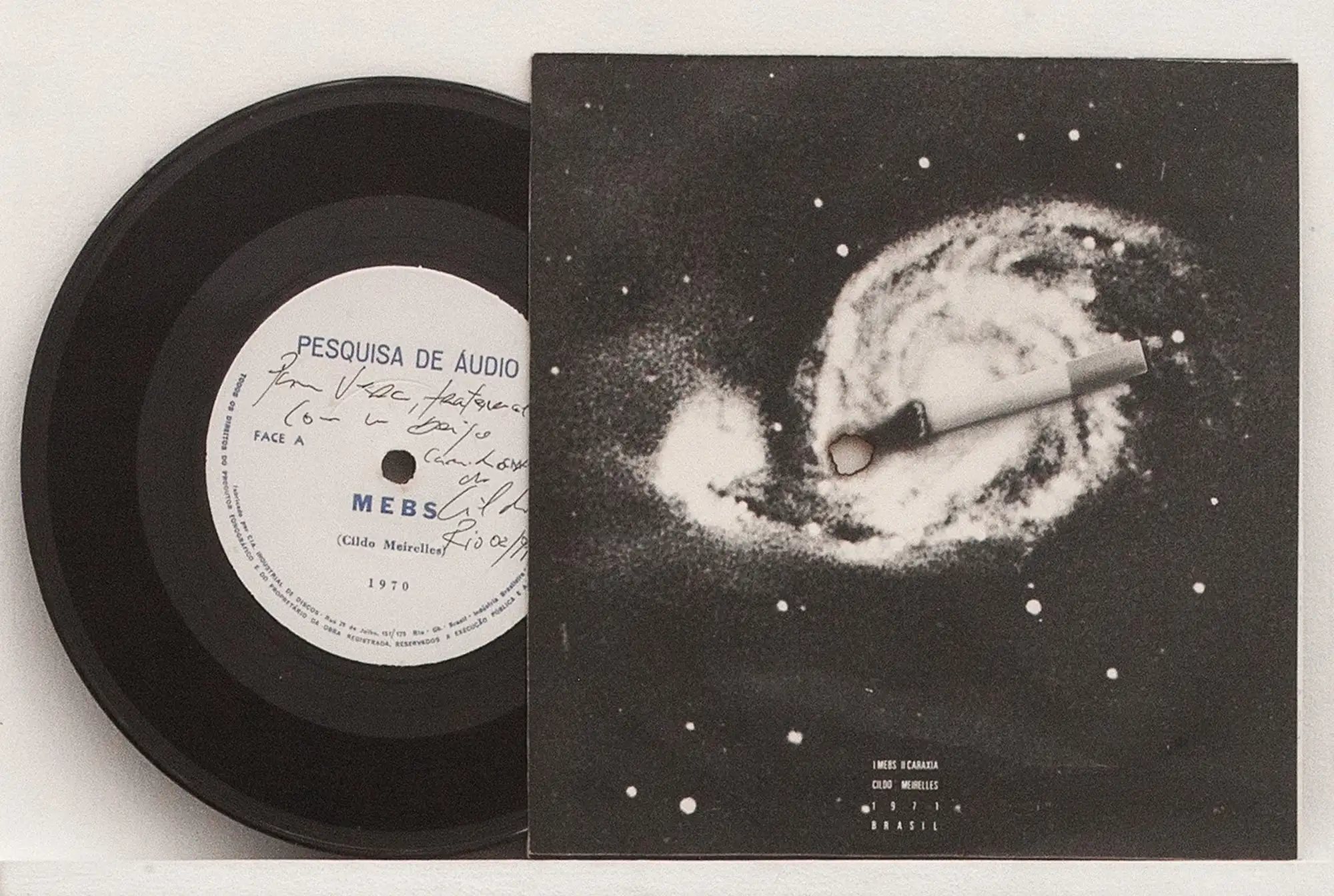 sua coerência e por uma linha de produção visual em contínuo e perceptível desenvolvimento, originando uma obra incomum, característica dos artistas que possuem um vínculo com a cultura brasileira e forte conhecimento do seu próprio país. Em 1969-70, o artista passa a relacionar uma série de ideias que remetem ao objeto “disco de vinil”. Ele considerava seriamente a ideia de articular o som com a topologia. Mebs/Caraxia, por exemplo, tem origem em dois gráficos sonoros. Um lado do disco chama-se Mebs, em função da fita de Moebius. Uma fita de Moebius é um espaço topológico obtido pela colagem das duas extremidades de uma fita apds se efetuar meia volta em uma