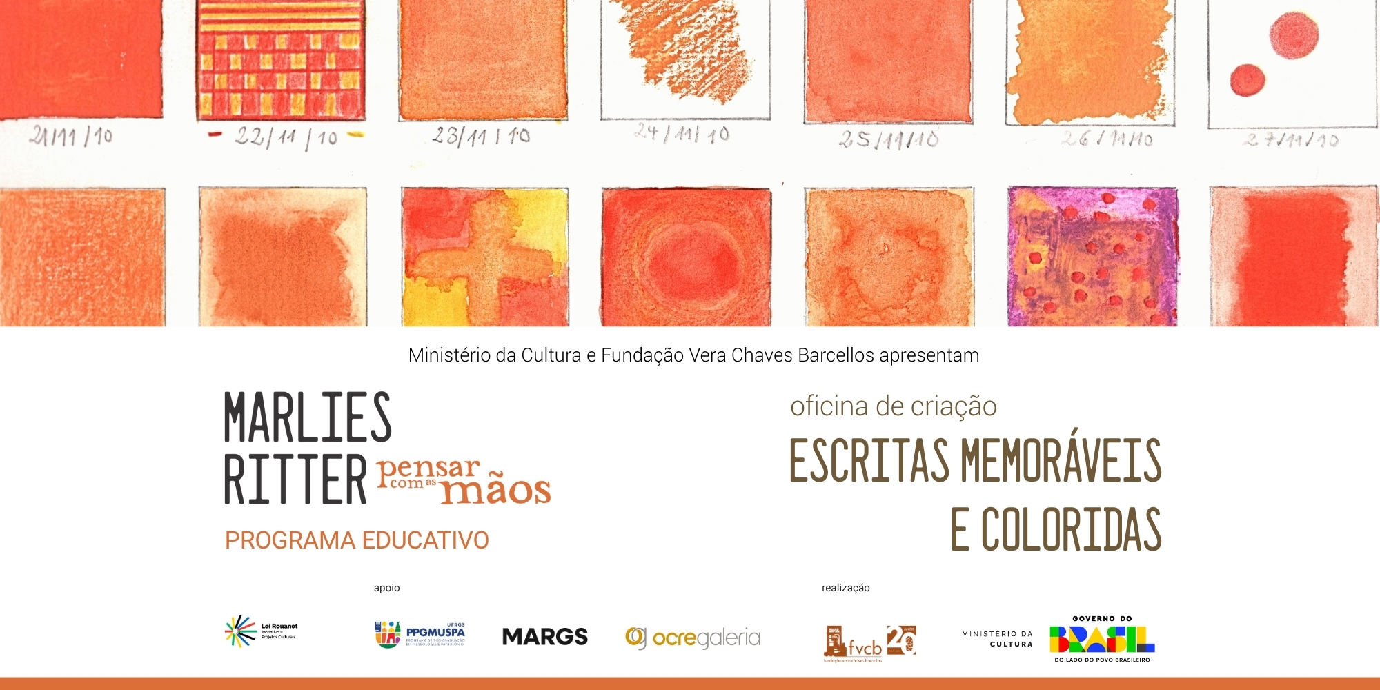 Como parte da programação educativa da exposição Marlies Ritter – Pensar com as mãos, a Fundação Vera Chaves Barcellos convida o público para a Oficina Escritas Memoráveis e Coloridas, com a artista visual e professora Helene Sacco, no dia 8 de novembro, sábado, das 14h30 às 16h30, na Sala dos Pomares (Rodovia Tapir Rocha, 8480 – parada 54, Viamão/RS). A inscrição é gratuita (acesse o formulário) e voltada para o público geral interessado. Obs: não precisa trazer material.