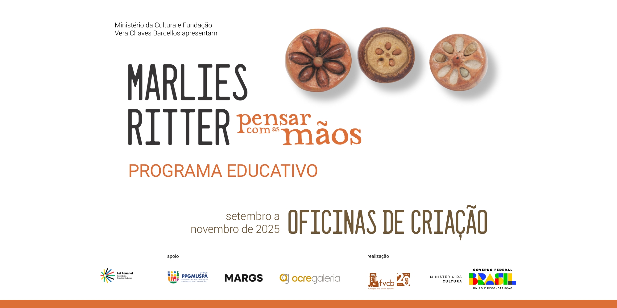 O Ministério da Cultura e a Fundação Vera Chaves Barcellos apresentam a programação educativa de oficinas de criação a partir da mostra Marlies Ritter – Pensar com as mãos, entre os meses de setembro e novembro de 2025. Todas as atividades são gratuitas e ocorrem na FVCB (Rodovia Tapir Rocha, 8480 – parada 54, Viamão/RS).