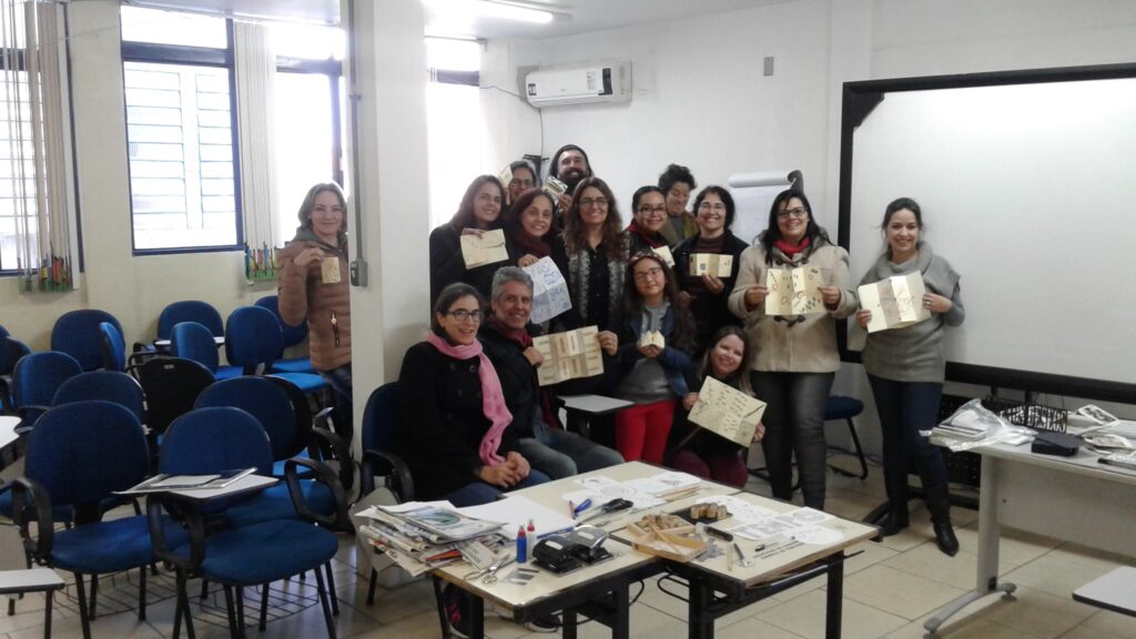 Dia 14 de julho, sábado, ocorreu na Sede da Secretaria Municipal de Educação de Viamão, o 5° encontro do Curso de Formação Continuada em Artes organizado pelo Setor Educativo da Fundação Vera Chaves Barcellos. Neste encontro, foi realizada uma oficina de livros de artistas com a professora e artista Solana Guangirioli.