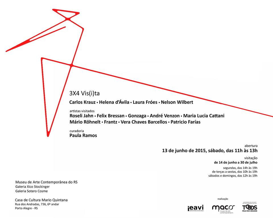 Neste sábado, dia 13 de junho, o Museu de Arte Contemporânea do Rio Grande do Sul apresenta a exposição 3X4 VIS(I)TA, na Galeria Xico Stockinger, onde o projeto teve início, e na Galeria Sotero Cosme. Obras de Vera Chaves Barcellos e Patricio Farías integram a mostra, que tem curadoria de Paula Ramos.
