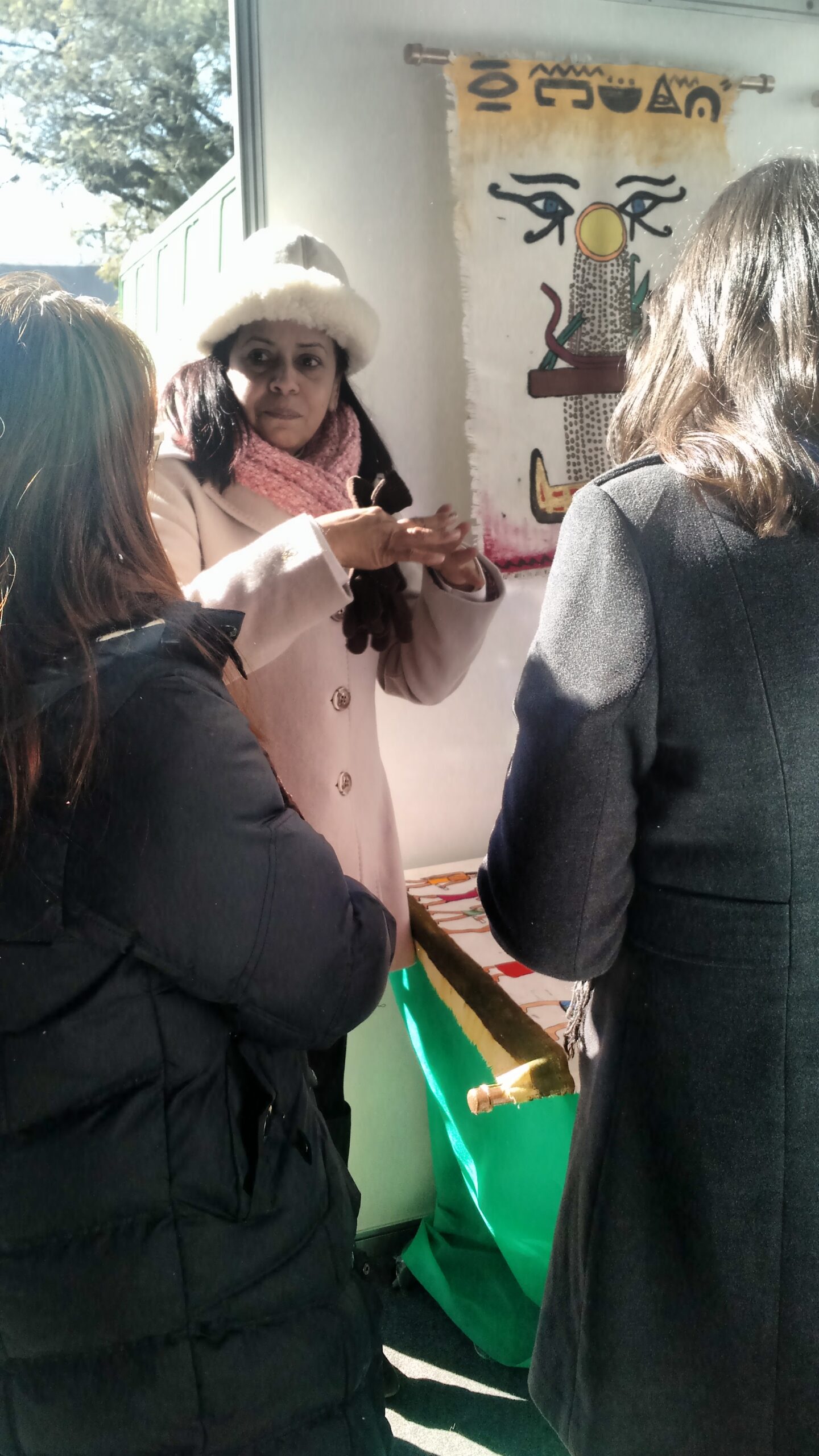 A professora Maria Aparecida da Rosa Jorge da E.M.E.F. Presidente Getúlio Vargas explicando o projeto da escola que resgatou a arte mortuária através da arte egípcia, na qual a vida e a morte, temas de trabalhos exibidos na exposição Humanas Interlocuções.