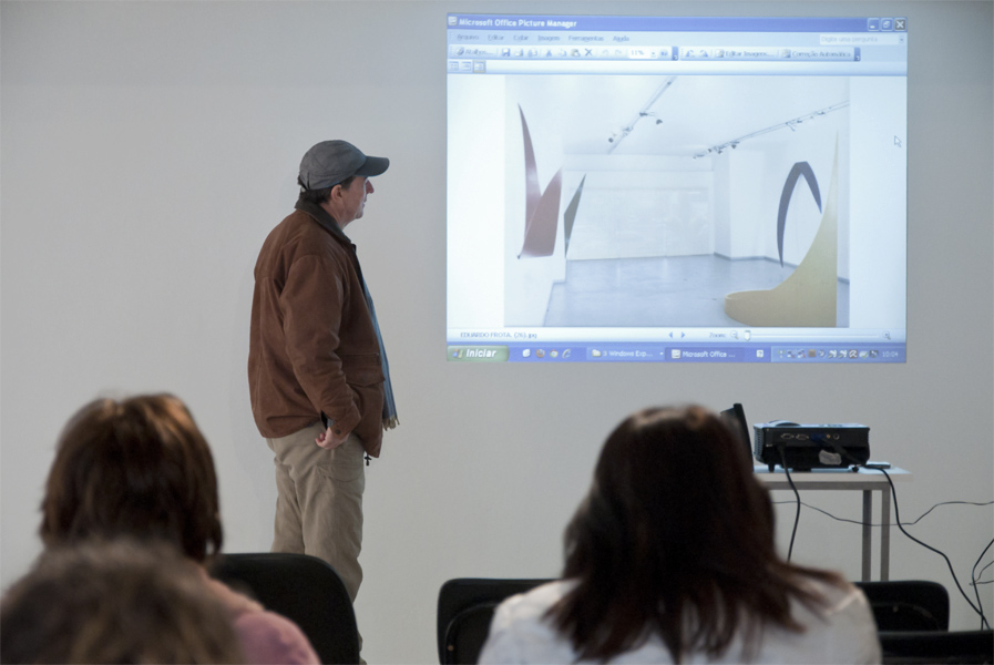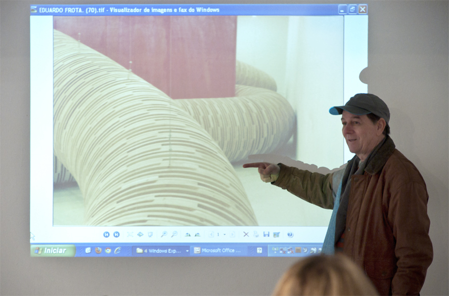 A FVCB trouxe a Porto Alegre o artista cearense Eduardo Frota que falou aos professores na sede da instituição em Viamão e ao público em geral no Santander Cultural, em Porto Alegre, dia 09/06.Ao lado da artista gaúcha Regina Ohweiler, as palestras fecharam o calendário de atividades paralelas à exposição Des|Estruturas, mostra na qual o público poderá conferir obras expostas de ambos os artistas e que segue em exibição na Sala dos Pomares até o dia 28/07. Confira as fotos dos encontros.