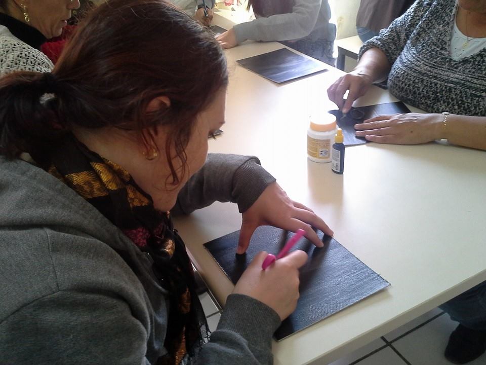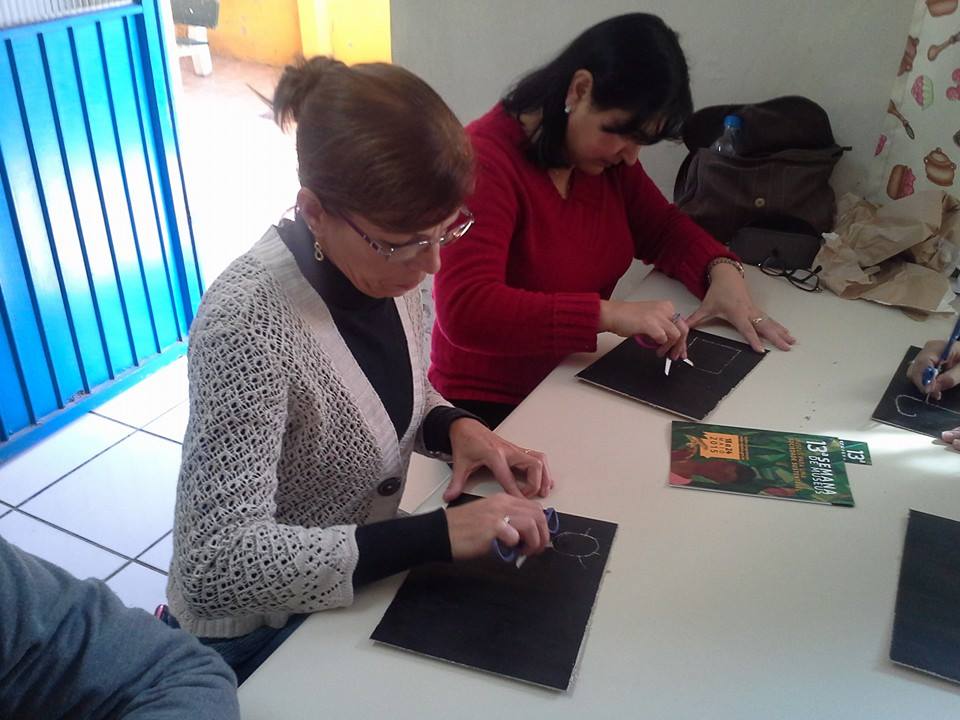 O segundo momento foi ocupado pela proposição da oficina, realizada com materiais de fácil manejo e obtenção: com papelão preparado com uma base branca, nanquim e ponta seca, foram  discutidas as possibilidades e a diversidade de técnicas gráficas a ser experimentadas com os alunos, tanto da educação infantil como das outras séries.