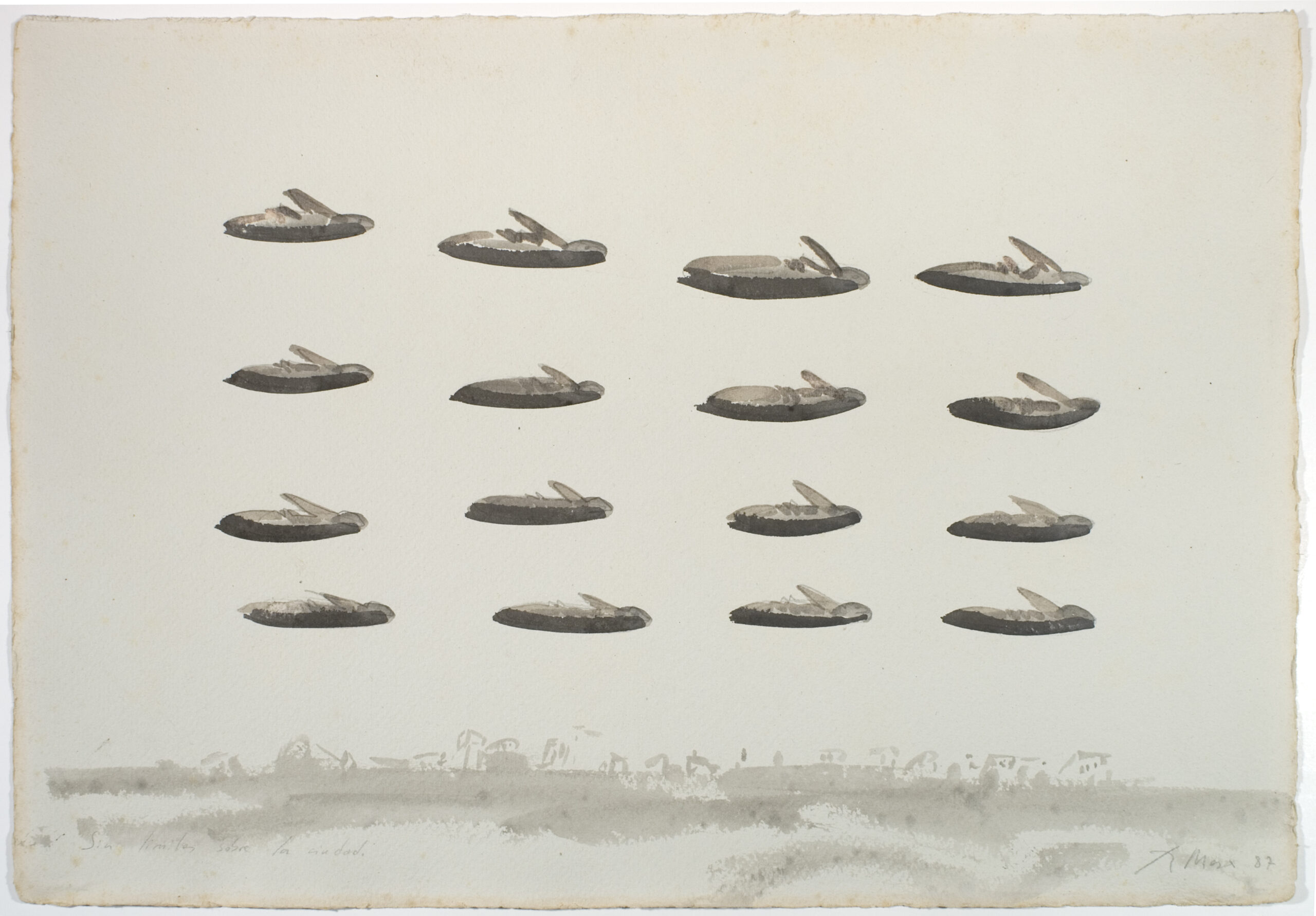 O outro desenho de Mesa que integra a exposição 80’s é Sin limites sobre la Ciudad (aguada de nanquim sobre papel, 1987).